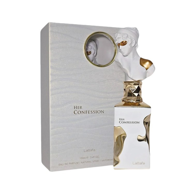 Sumérgete en los secretos de Lattafa Her Confession 100 ml EDP, una enigmática fragancia femenina que revela la profundidad y el misterio del alma femenina. Sus seductoras notas de salida de bergamota, frambuesa y pimienta rosa se entrelazan con un corazón apasionado de jazmín, gardenia y flor de azahar, para culminar en un fondo intenso y persistente de vainilla, ámbar, almizcle y sándalo. Esta exquisita creación de Lattafa está diseñada para la mujer que guarda sus secretos con elegancia y los revela solo a quien merece descubrirlos. El sofisticado frasco refleja la complejidad y el encanto de esta composición única.
